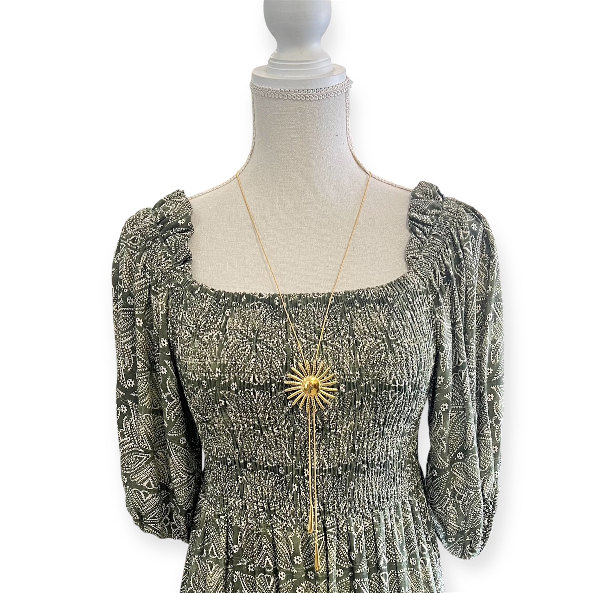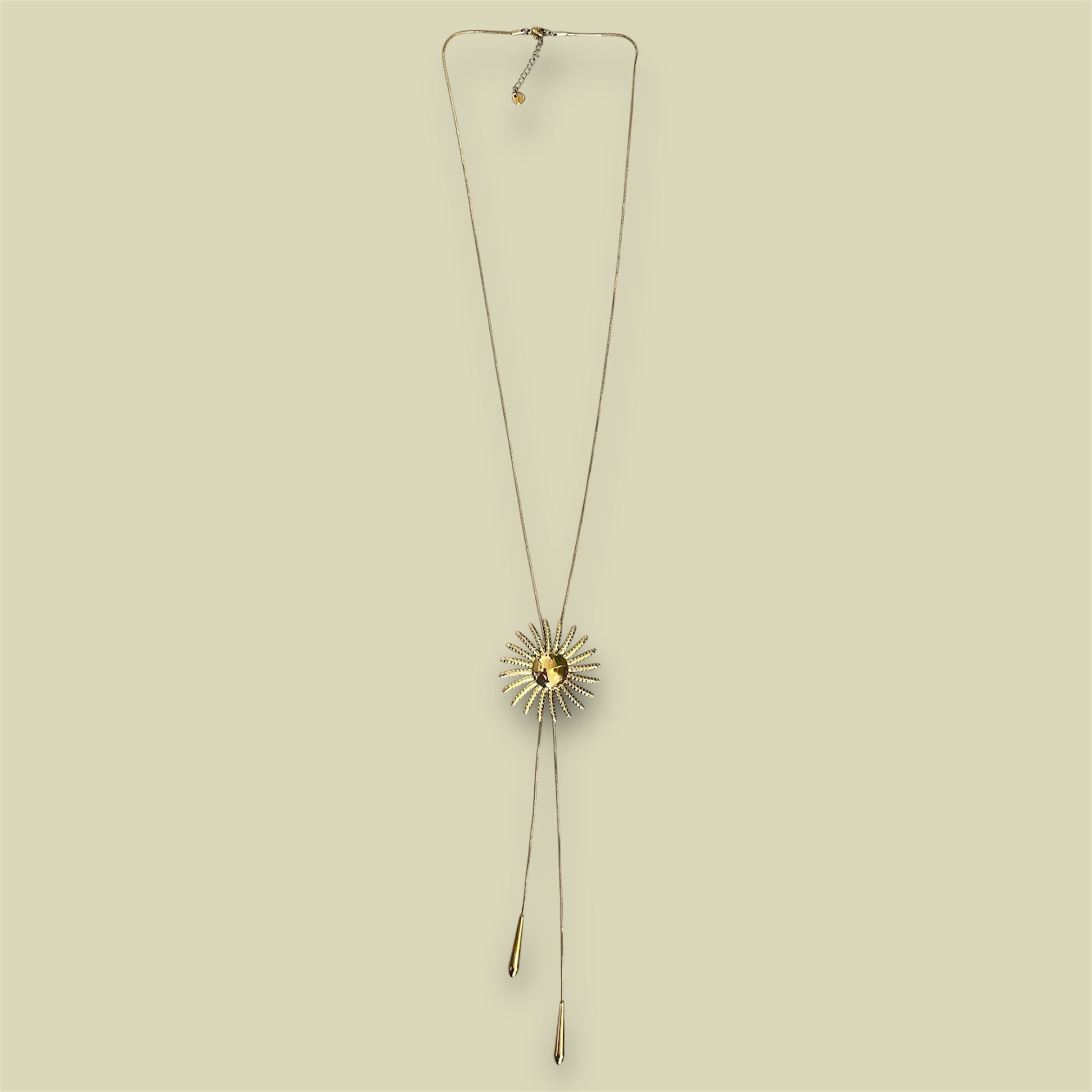 Collar largo realizado en acero inoxidable, con dije de sol, aporta luz y estilo a tu look.